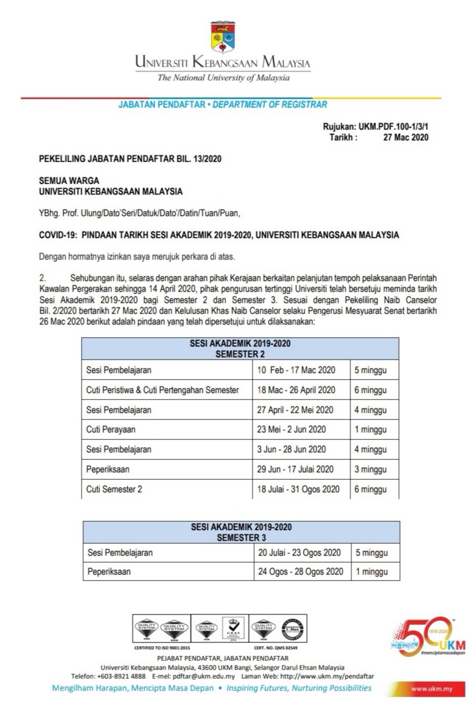 Ukm Malaysia On Twitter Pekeliling Jabatan Pendaftar Bil 13 2020 Mengenai Covid 19 Pindaan Tarikh Sesi Akademik 2019 2020 Ukm Ukmcircular Ukminfo Akademiukm Ukm Ukmsharing Https T Co Vowyg1aadq Twitter